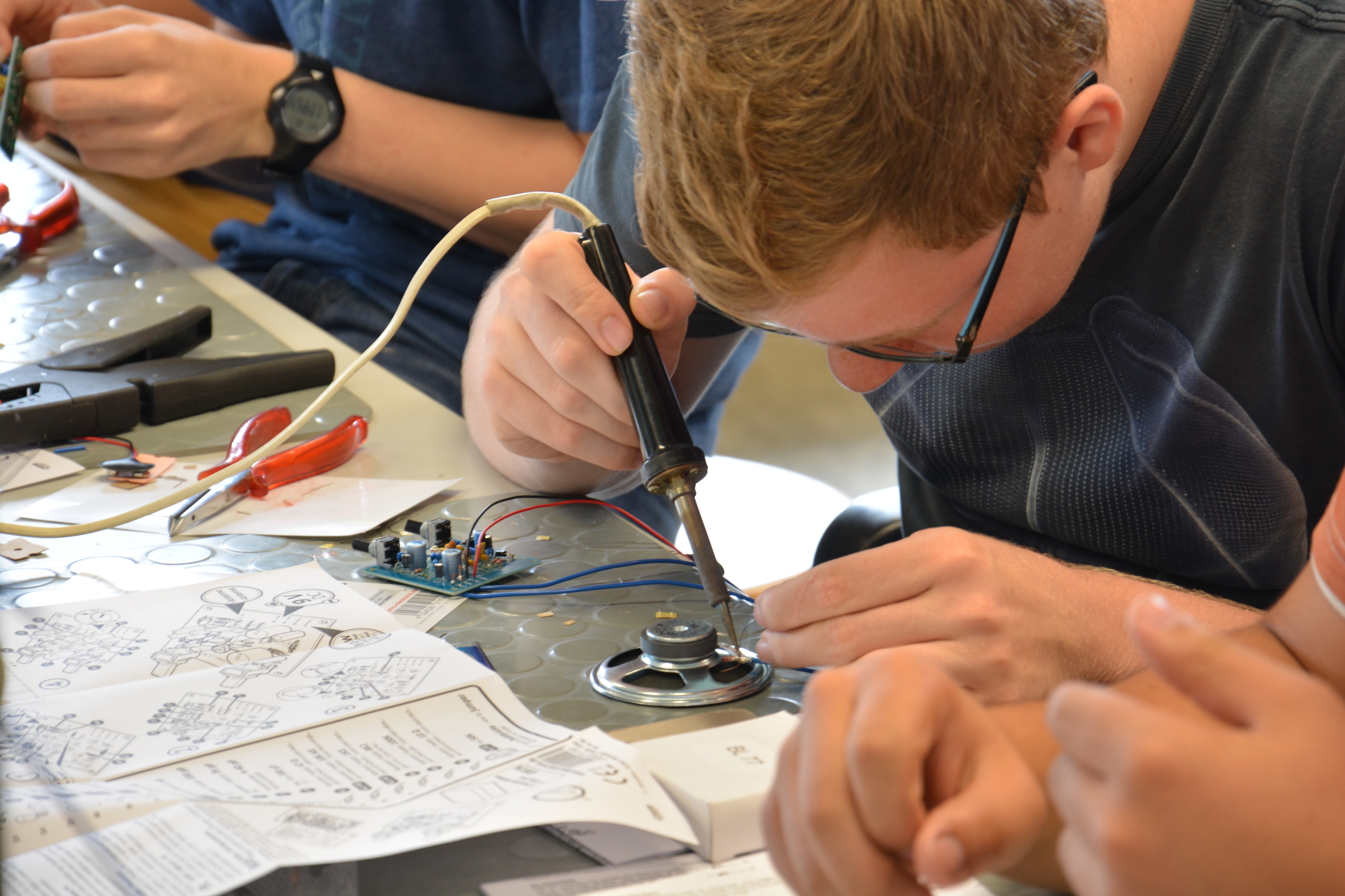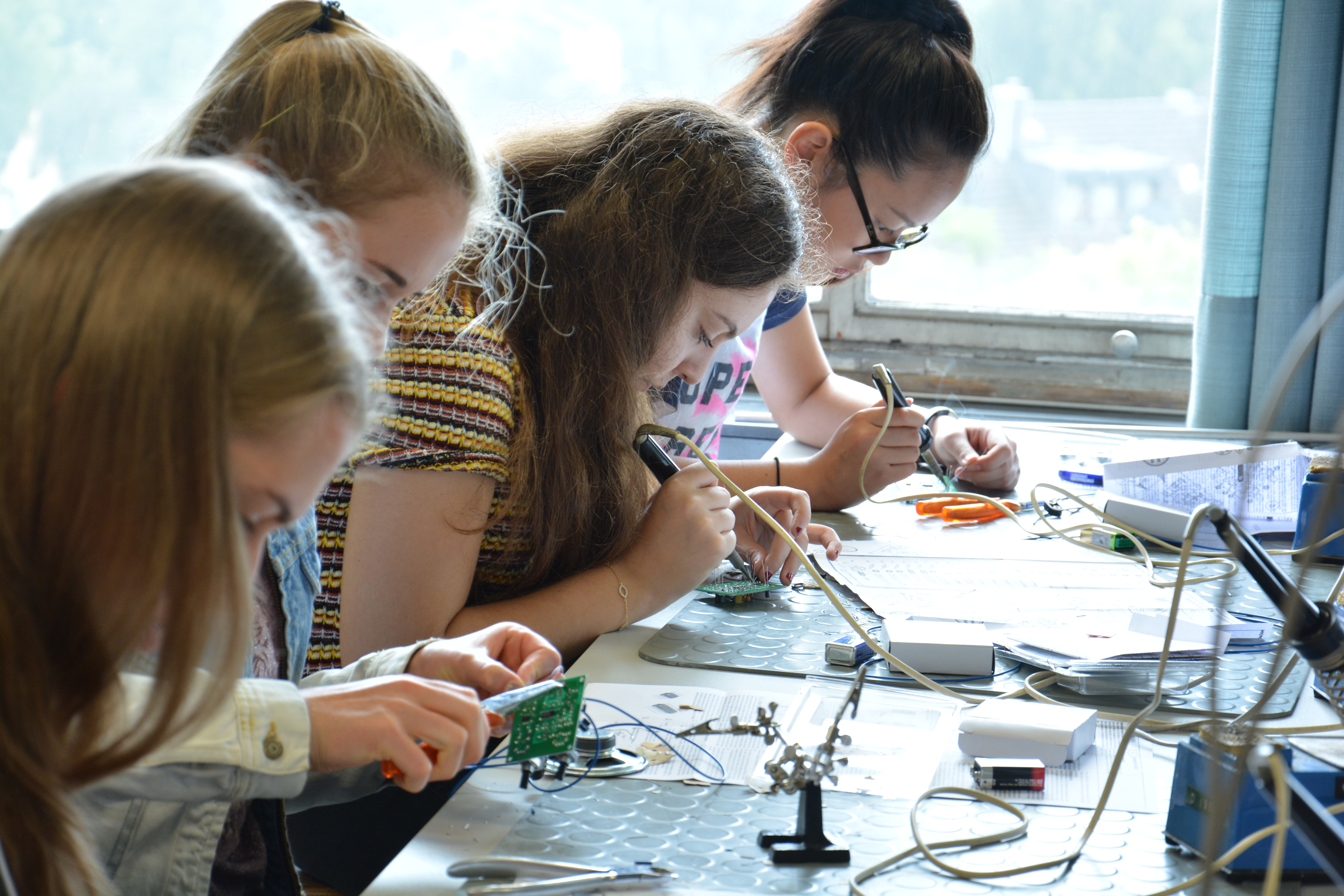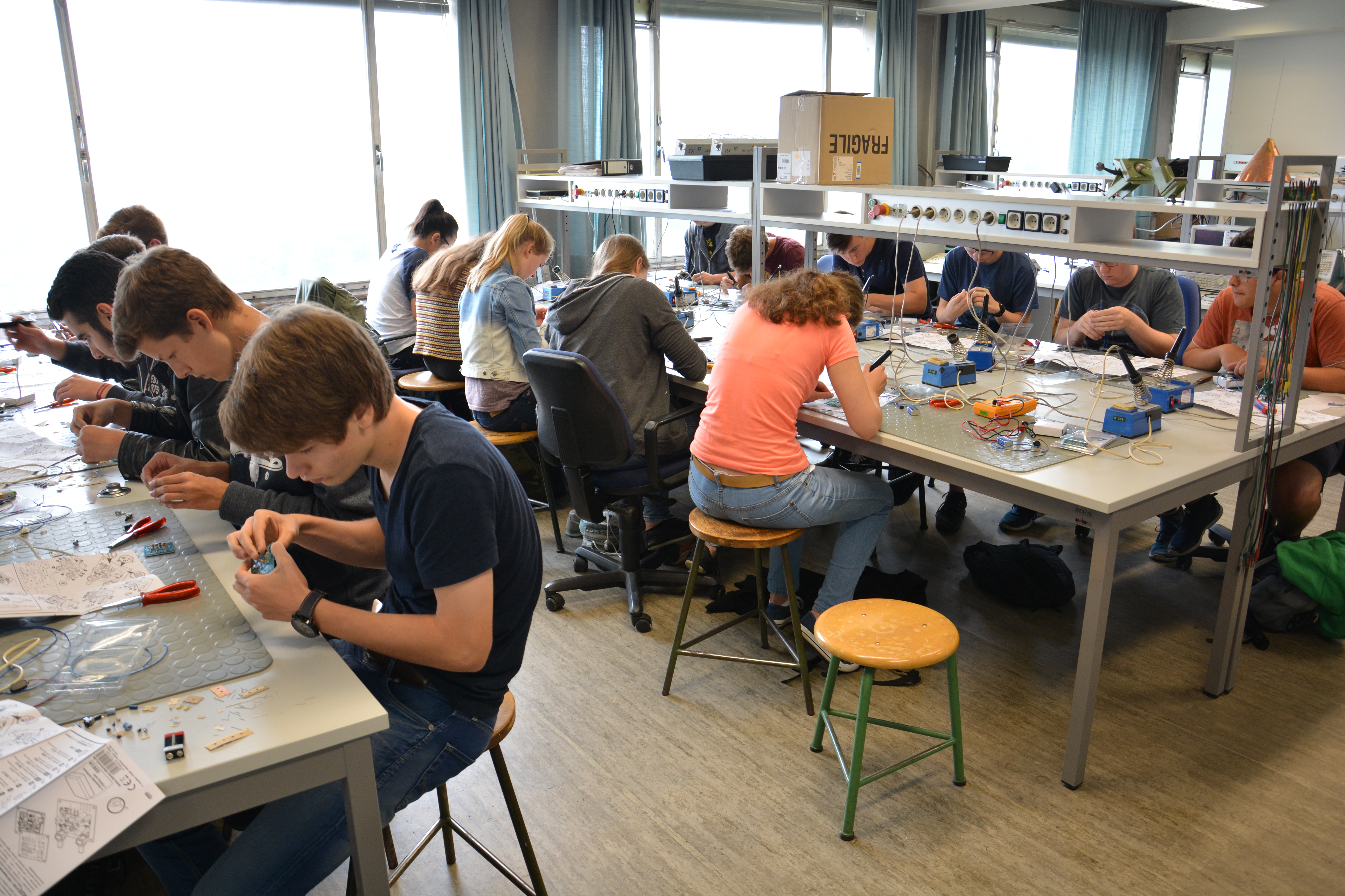 Nach einer kurzen Vorstellung des Instituts begaben sich die Schülerinnen und Schüler in den Praktikumsraum, um die für sie vorbereitete Aufgabe anzugehen. Passend zum Profil des IHF wurden UKW-Radio-Bausätze aufgebaut. Viele Jugendliche hatten schon Erfahrungen im Löten, so dass die meisten selbstständig nach 2 Stunden ihrer Platine Musik entlocken konnten. Abgeschlossen wurde das Programm mit einer Führung durch das Institut, bei der die Antennenmesskammern und Labore vorgestellt wurden.